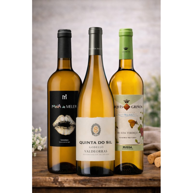 Este pack reúne la originalidad de un blanco del Somontano elaborado con uvas tintas, la expresión aromática y elegante de la Verdejo de Rueda y la profundidad de una Godello de viñas viejas en Valdeorras.